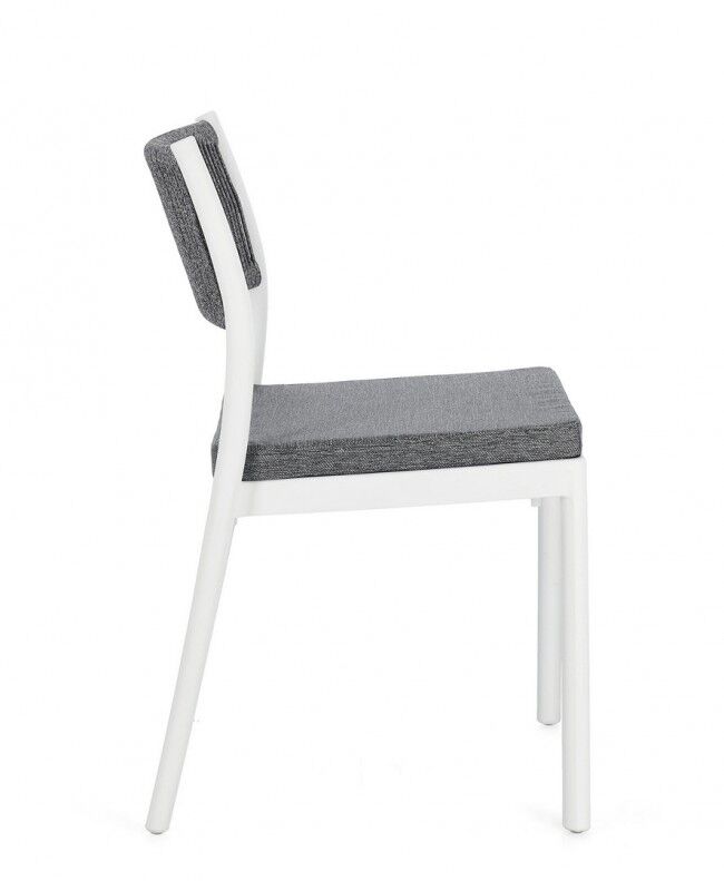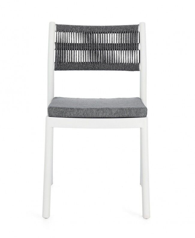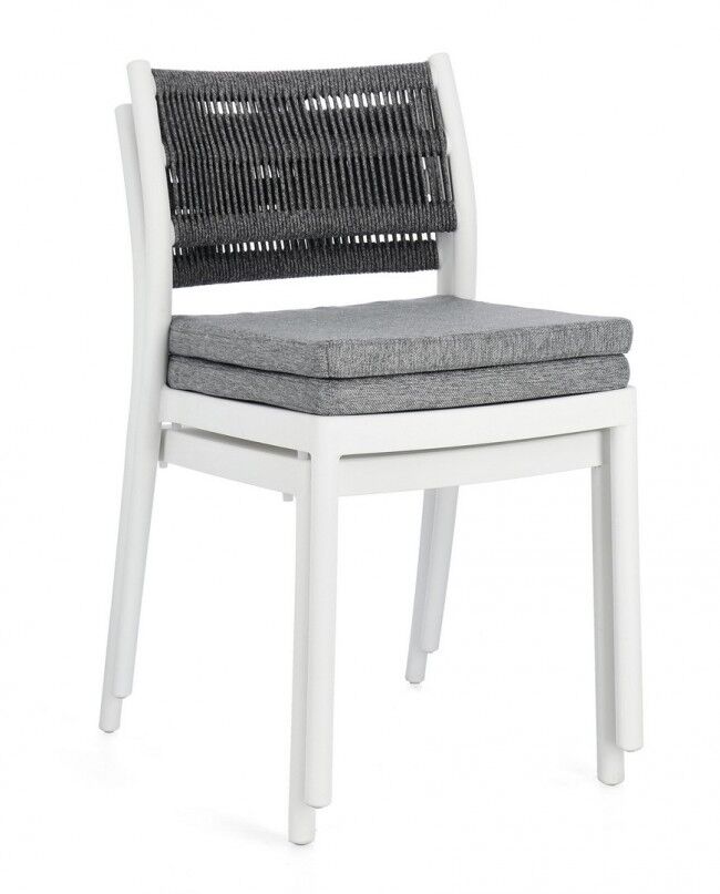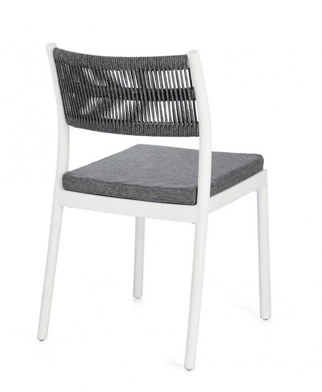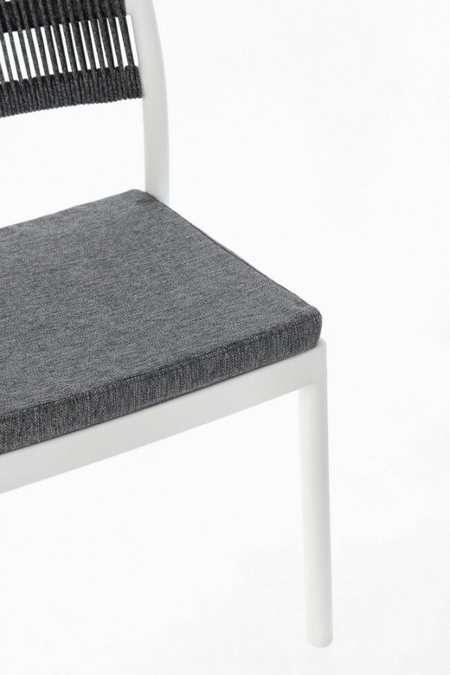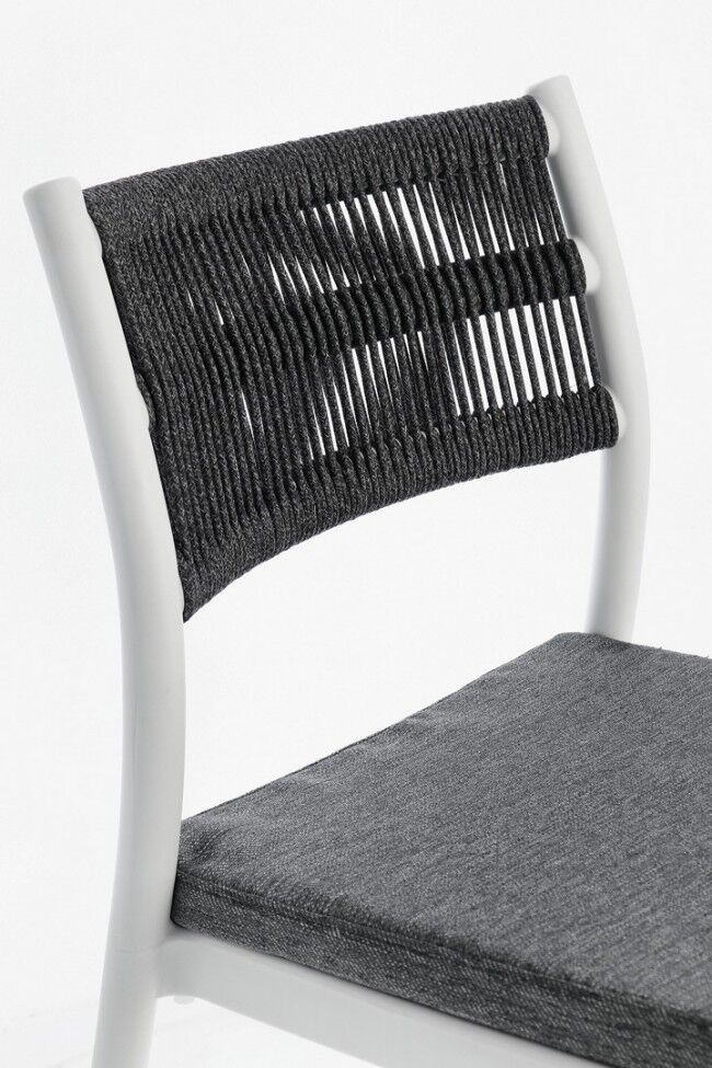 Vrtna stolica ALVIN bijela/tamno siva od polipropilena otpornog na UV zračenje s naslonom od pletenog poliesterskog konopa i odvojivim vodootpornim jastukom. Elegantna i sklopiva stolica za udobnost na otvorenom.