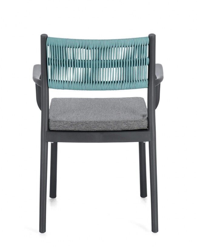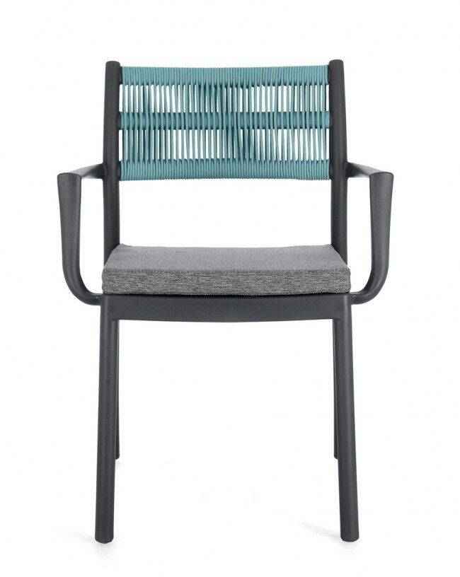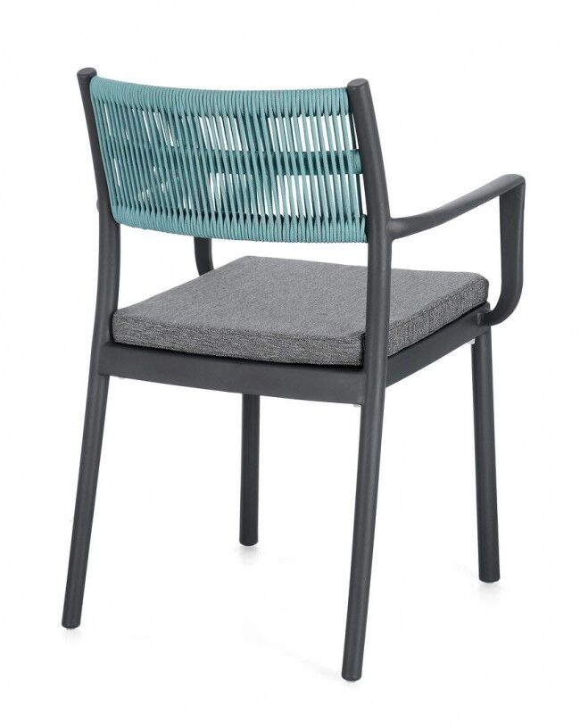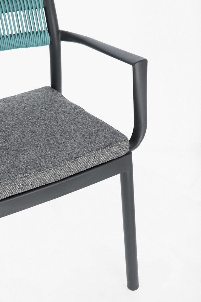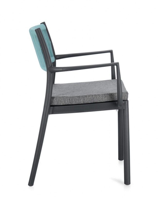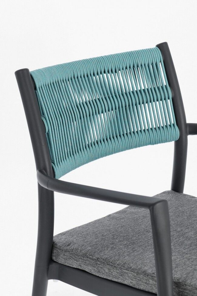 Elegantna i udobna vrtna stolica ALVIN s naslonima za ruke i jastukom u boji antracit / avio , izrađena od polipropilena i poliesterske užadi, otporna na UV zračenje i vodootpornim jastukom. Idealan izbor za moderne vanjske prostore