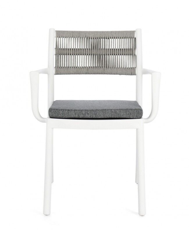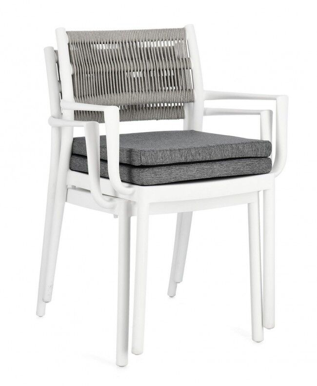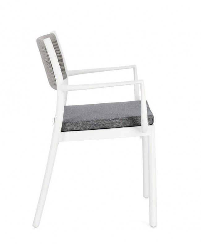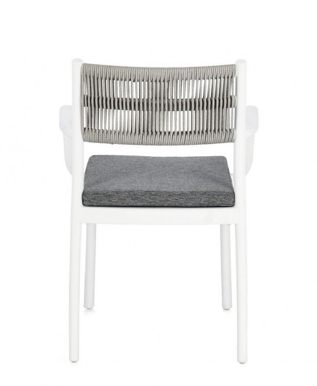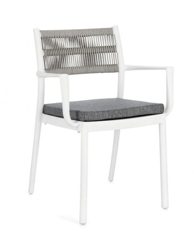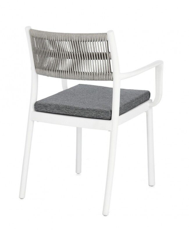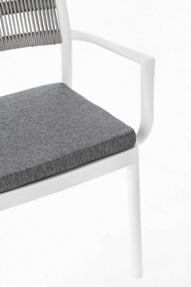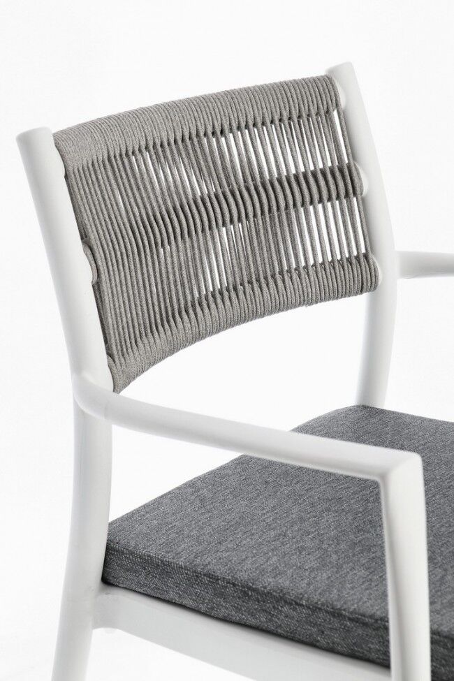Elegantan i praktičan stolac ALVIN s naslonima za ruke i jastukom u boji bijela - svijetlosiva, izrađen od polipropilena s naslonom od poliesterskih užadi i vodootpornim jastukom. Idealan za unutarnje i vanjske prostore.