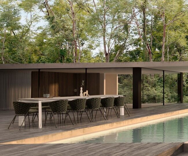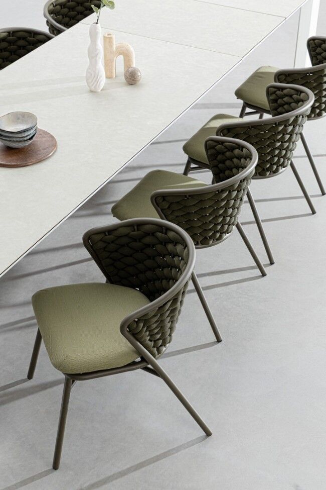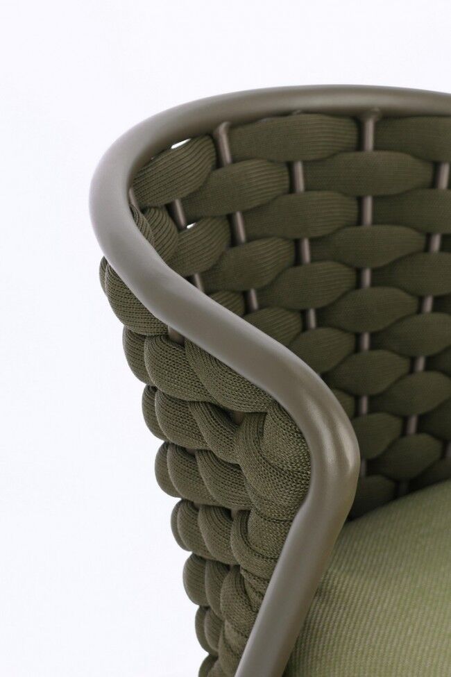 - Pleteni tekstil od užeta Textilene : Naslon i sjedalo stolca pleteni su užetom Textilene koje sadrži nitritnu gumu. Ovaj materijal je izuzetno izdržljiv, prozračan i otporan na vremenske uvjete, osiguravajući udobno pristajanje.
