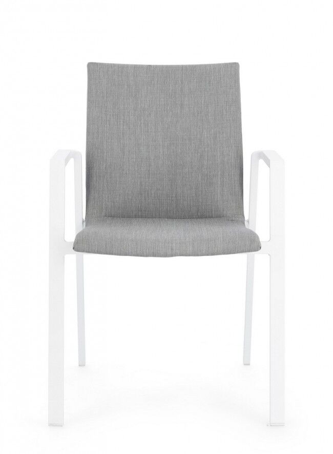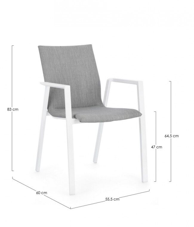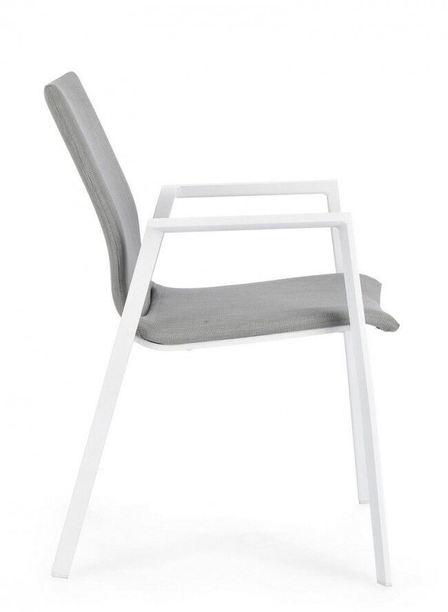 - Stil : Stolica ima moderan dizajn s bijelom aluminijskom konstrukcijom i presvlakom od kvalitetne sive tkanine, što je čini prikladnom za moderne vanjske prostore.