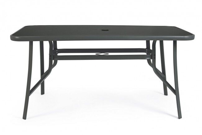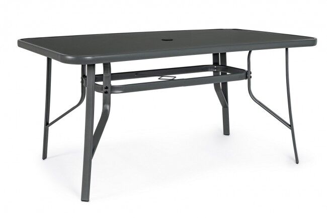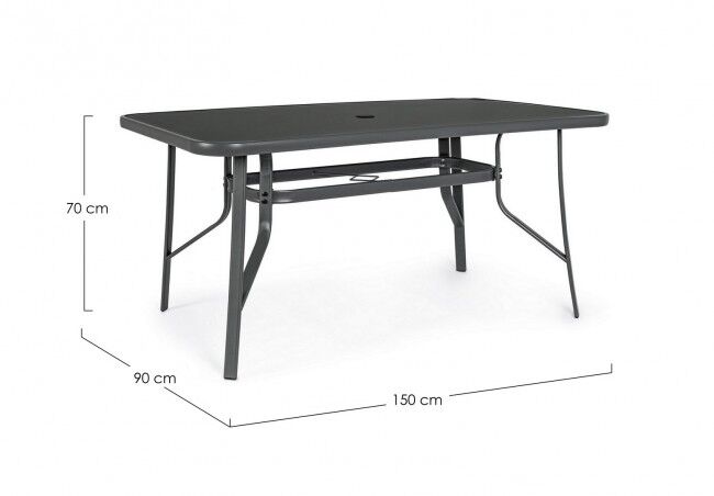 Izdržljiv i elegantan vrtni blagovaonski stol MARTINEZ 150x90 za šest osoba. Čelična konstrukcija i površina od kaljenog stakla osiguravaju trajnost i moderan izgled. Idealan izbor za vanjsku upotrebu.