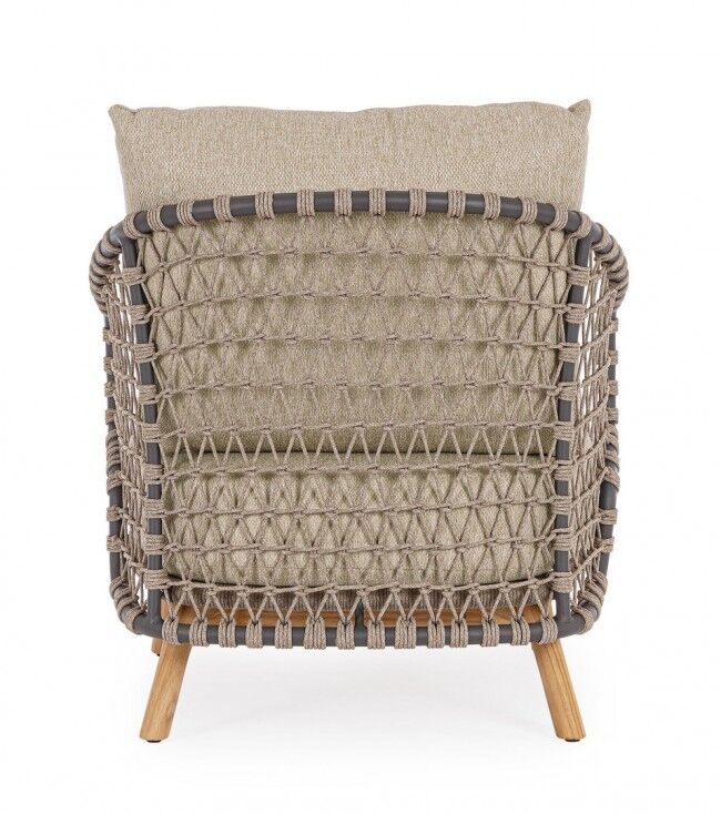 Vrtna fotelja EULARIA s jastucima u prirodnoj boji pijeska i toplim smeđim tonovima donosi savršen spoj udobnosti i suvremenog dizajna. Konstrukcija je izrađena od aluminija s praškastim premazom, a noge od čvrstog tikovog drva (certifikat SVLK). Nasloni su ručno ispleteni polipropilenskim užetom otpornim na vremenske uvjete. Sjedalice i nasloni za leđa prekriveni su tkaninom Olefin u usklađenoj boji. Idealna je kao samostalni komad ili dio kolekcije EULARIA.