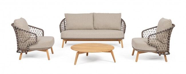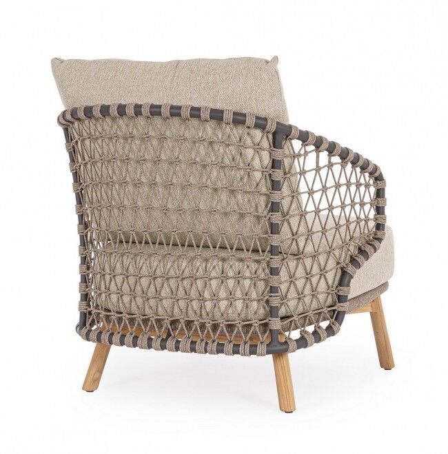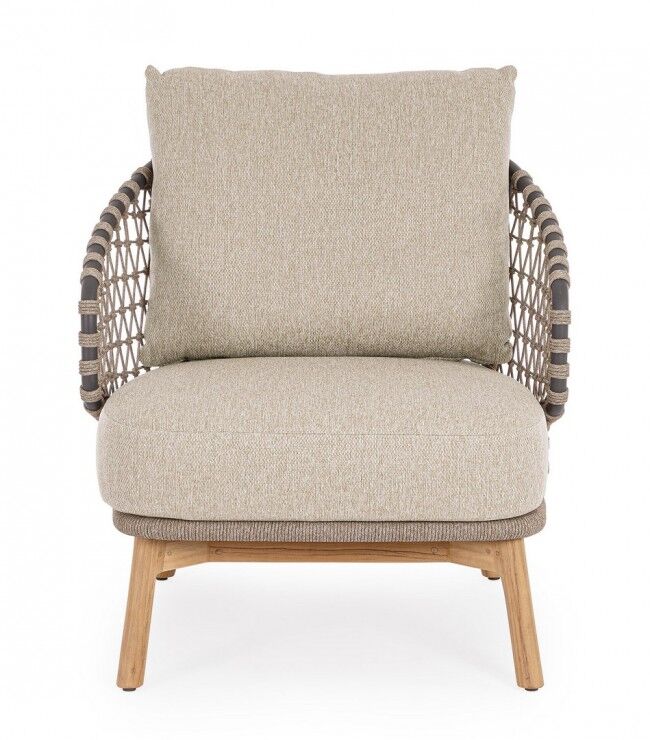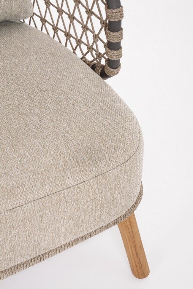 EULARIA vrtna fotelja u boji prirodnog pijeska s nogama od tikovine i ručno pletenim naslonima. Elegantan izbor za terase, vrtove i luksuzne dnevne sobe.