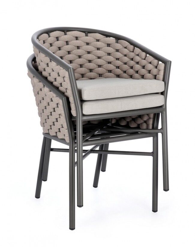 Vrtna fotelja MARGALIDA antracit/khaki elegantnog dizajna i sofisticirane prirodne khaki boje, koja spaja nijanse svijetlosmeđe i maslinastozelene, savršen je izbor za vanjske prostore. Izdržljiva aluminijska konstrukcija isprepletena je polipropilenskim užetom otpornim na vremenske uvjete kako bi se osigurala izdržljivost i dugovječnost. Udobnost nadopunjuju kvalitetni jastuci dizajnirani za potpuno opuštanje. Dizajn koji se može složiti omogućuje pohranu koja štedi prostor.