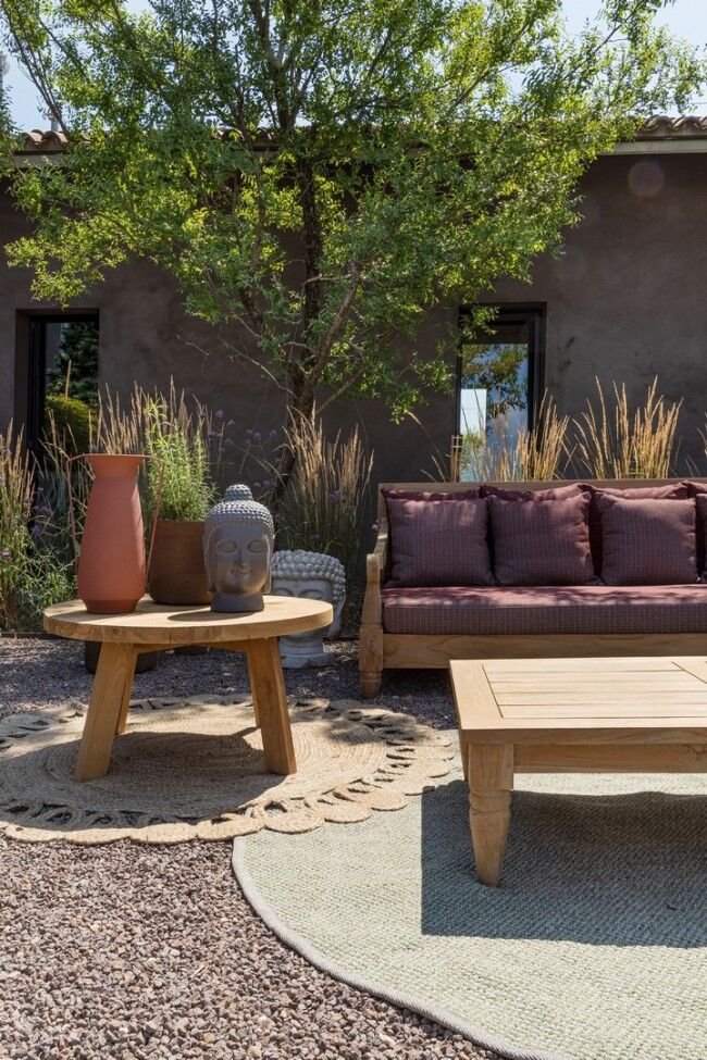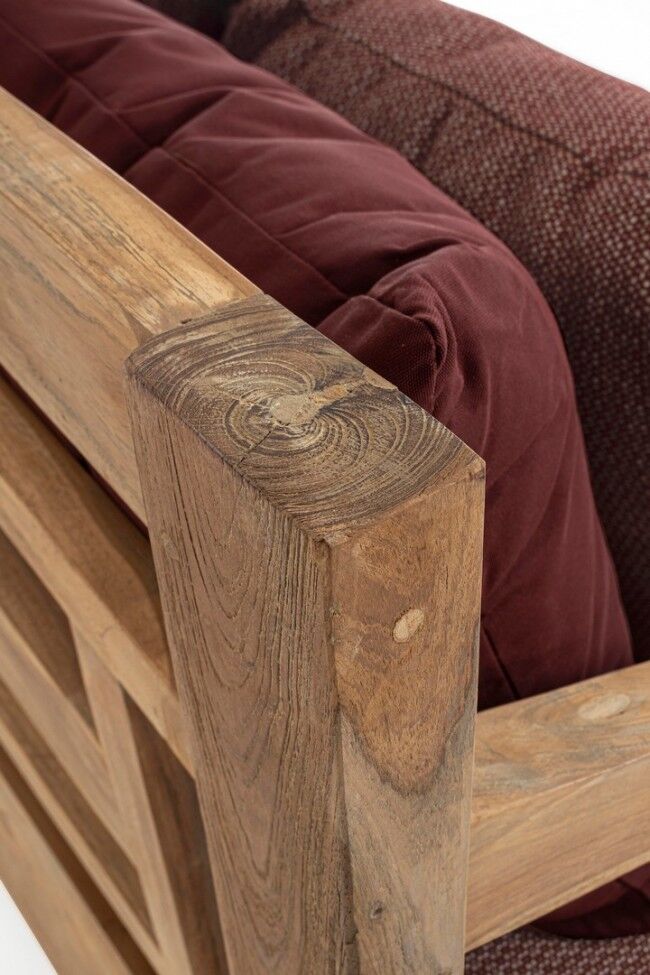 Vrtni kauč postelja BALI WINE - FSC teak je elegantan komad vanjskog namještaja dizajniran za uživanje na otvorenom sa stilom. Sa svojim prirodnim drvom i jastucima u boji u vinskoj nijansi, unosi udobnost i eleganciju u svaki vrt ili terasu.