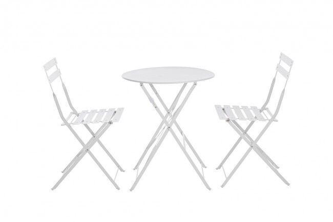 Vrtni set BISTROT AUSTIN – bijeli. Sklopivi komplet za manje terase: 2 stolice + 1 stol. Čelik s e‑coatingom i prašnim lakom.