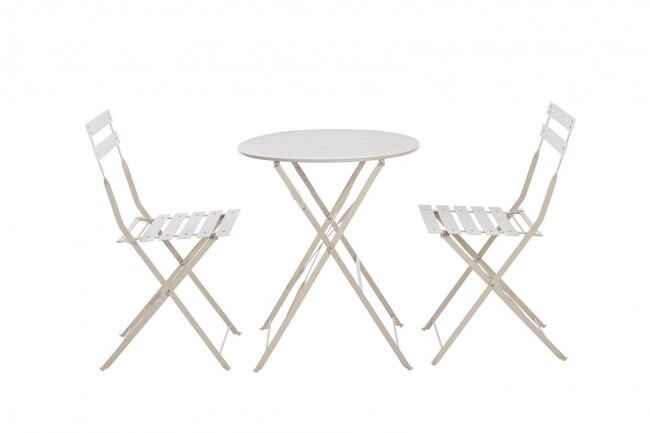 Vrtni set 3-dijelni BISTROT AUSTIN – gypsum. U kompletu su 2 sklopive stolice i 1 sklopivi stol. Elegantan i praktičan set za terase, balkone i vrtove.