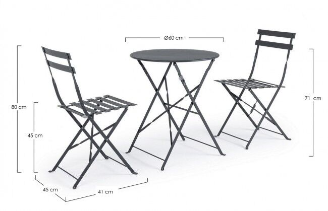 Opis: Elegantan i praktičan vrtni set Bistrot Wissant u antracit boji idealan je za male vanjske prostore. Izrađen je od visokokvalitetnog čelika obloženog prahom za dugotrajnu otpornost na vremenske uvjete . Set uključuje sklopivi stol i dvije sklopive stolice , što olakšava spremanje i premještanje.