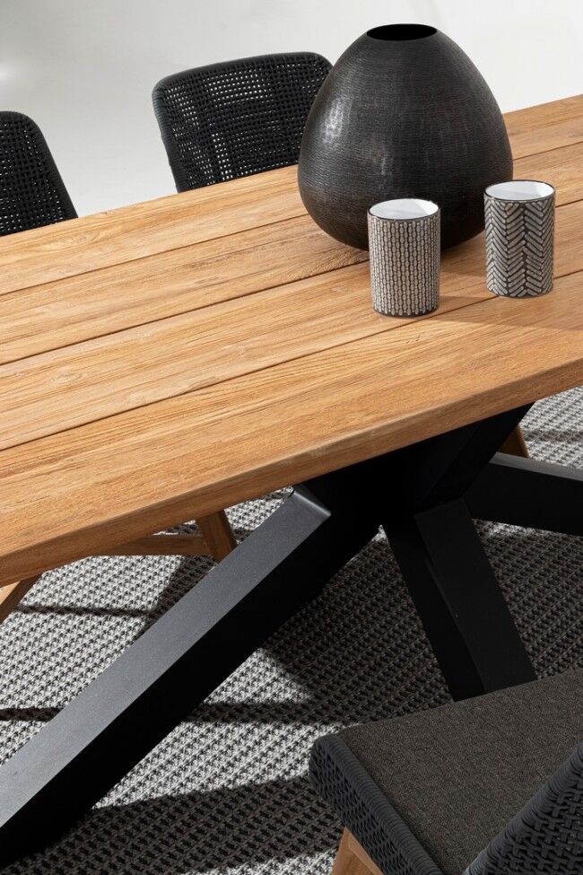 Vrtni stol RAMSEY 240X100 u elegantnoj crnoj boji izrađen je od recikliranog tikovog drva, što osigurava trajnost i jedinstven izgled. Površina stola je od tikovine, certificirane prema SVLK standardu, što znači da dolazi iz održivo upravljanih šuma. Prirodna četkana obrada naglašava prirodnu ljepotu drva. Noge su od aluminija, premazane poliesterskim prahom, što osigurava trajnost i otpornost na vremenske uvjete. Vijci su od nehrđajućeg čelika, što osigurava otpornost na hrđu, a nogice su podesive za stabilnost na neravnim površinama. Drveni proizvod od recikliranog tikovog drva karakterizira prisutnost drvenih umetaka različitih vrsta i boja. Moguće pukotine, pukotine ili nesavršenosti, koje se mogu pojaviti i tijekom vremena, karakteristike su ovog materijala i čine svaki komad jedinstvenim i originalnim. Noge se moraju sastaviti, što omogućuje jednostavan transport i skladištenje.