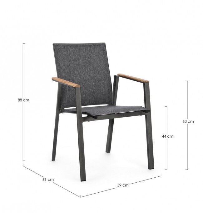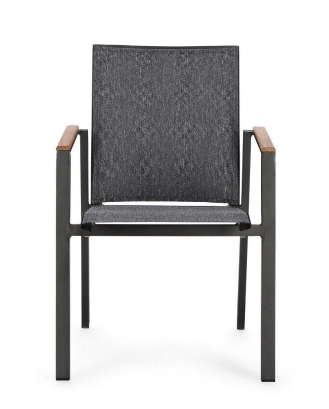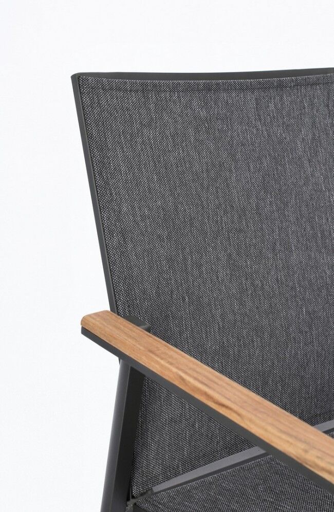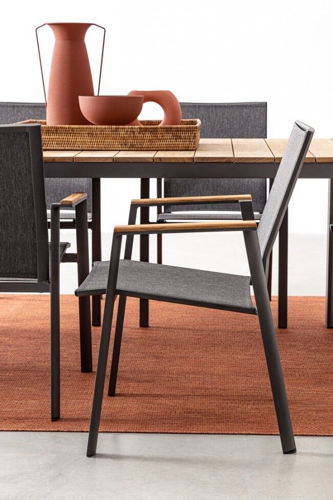 - Stil: Stol je oblikovan v sodobnem slogu z antracit barvo aluminija in naravnimi vstavki iz tikovine, kar mu daje eleganten videz.