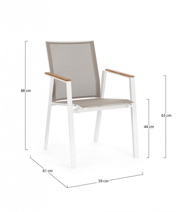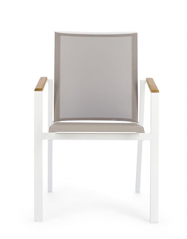 - Stil: Moderni stol v beli barvi s podrobnostmi iz naravne tikovine, ki dopolnjuje sodobne zunanje prostore.