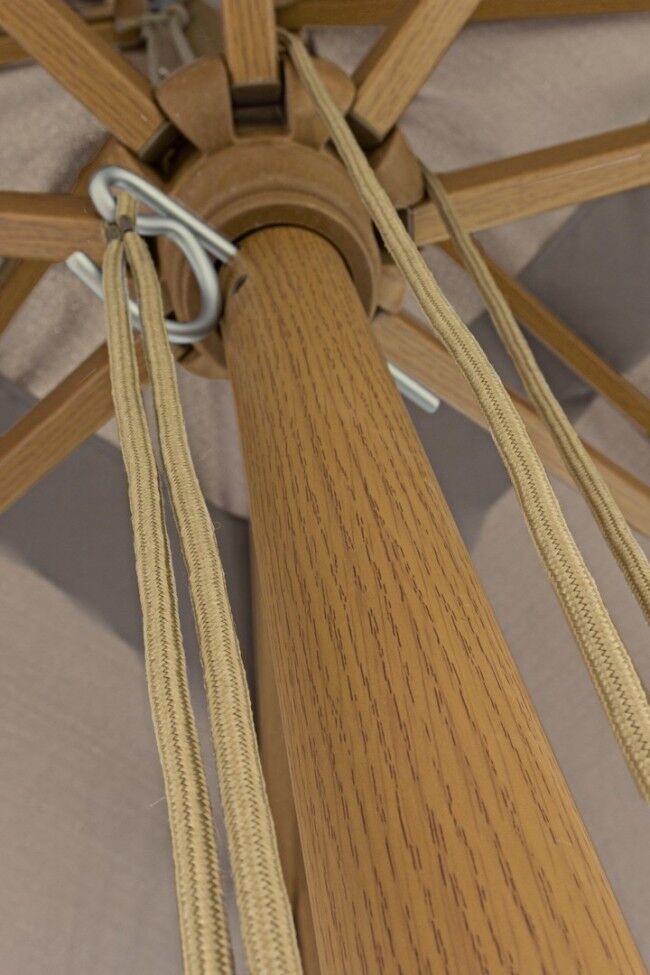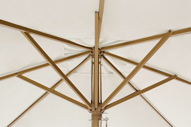 4. **Prevleka iz Poliestra**: Prekrivalo dežnika je narejeno iz kakovostnega poliestra naravne barve, teže 235 g/m², ki zagotavlja odpornost proti vremenskim vplivom in UV žarkom.