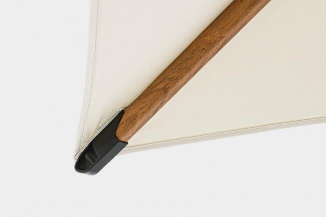 - **Konstrukcija**: Dežnik ima prašno barvano aluminijasto konstrukcijo, ki posnema videz lesa. Pol dežnika meri 90x60 mm, kar daje veliko stabilnost in trajnost.