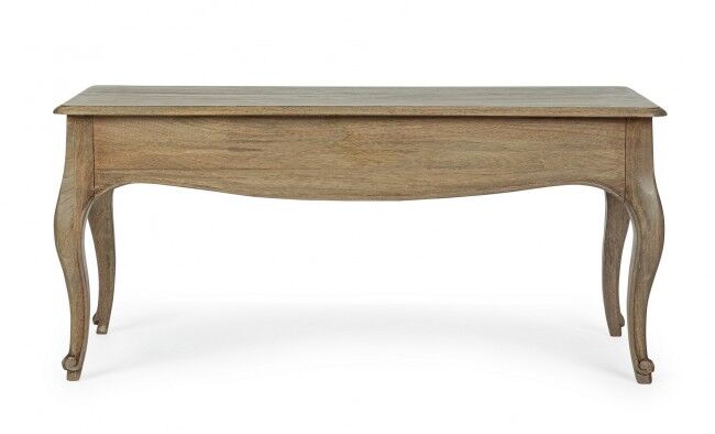 Konzolna mizica DOMITILLE 110x55 je prefinjen in funkcionalen kos pohištva, ki dopolnjuje klasične interierje. Izdelana je iz mangovega lesa, medtem ko je dno predala iz MDF-ja. Površina je premazana z vodnim lakom, ki ščiti les in poudarja njegovo naravno teksturo. Kovinski ročaji iz litega železa dodajo rustikalen pridih, hkrati pa zagotavljajo trpežnost in udobno uporabo.