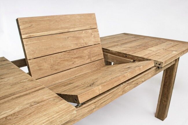 Raztegljiva miza BOUNTY 180-250 iz reciklirane tikovine: Izdelana iz certificirane reciklirane tikovine (SVLK) z rustikalno obdelavo. Debelina plošče 4 cm, noge velikosti 9,5x9,5 cm. Vključuje nerjaveče jeklene strojne dele in aluminijasto drsno palico. Osrednji podaljšek na metuljčka. Recikliran les ima značilne lesene vložke različnih vrst in barv; razpoke, razpoke in nepopolnosti, ki se lahko pojavijo s časom, so značilnosti tega materiala, zaradi česar je vsak kos edinstven. Noge je potrebno sestaviti.
