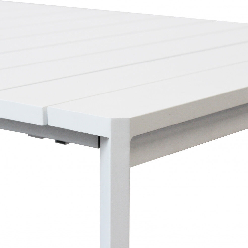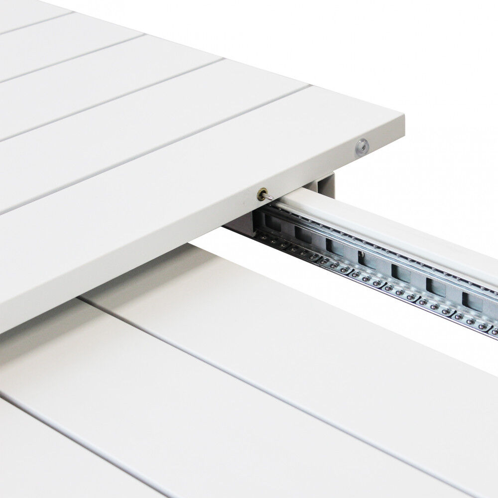 Raztegljiva vrtna jedilna miza BROOKLYN 200/250×100 – bela združuje sodobno obliko, kakovost in funkcionalnost. Konstrukcija je iz prašno barvanega aluminija, odporna na rjo, UV žarke in vlago. Enostaven mehanizem omogoča razširitev z dolžine 200 cm na 250 cm, kar nudi dodatno udobje za druženja na prostem.