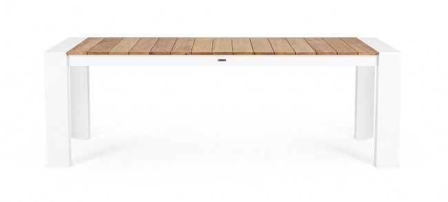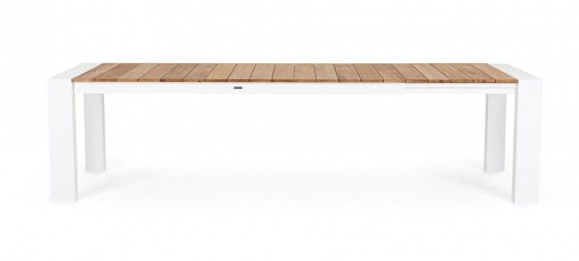 Raztegljiva vrtna miza CAMERON 228/294X100 bela GK50 z aluminijasto konstrukcijo in površino iz teakovine. Teleskopska odprtina, nastavljivi plastični nogici. Noge je potrebno sestaviti.
