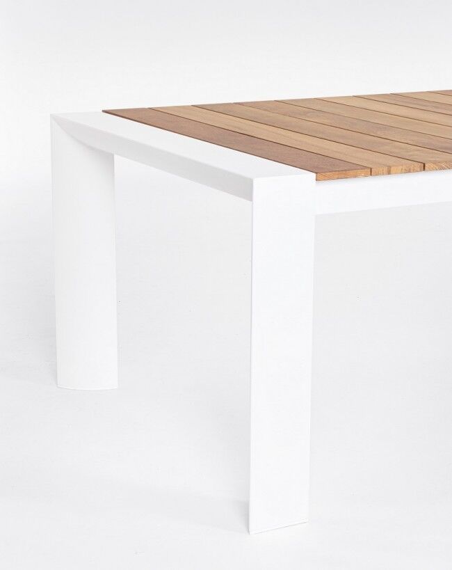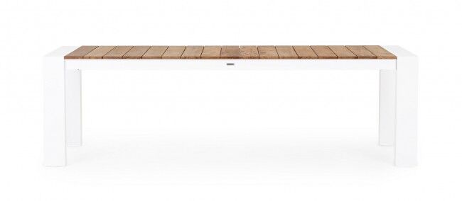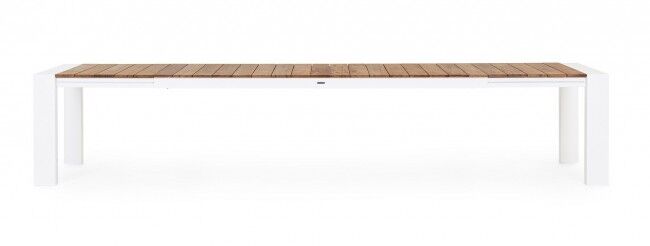 Elegantna in funkcionalna raztegljiva vrtna miza CAMERON z belo aluminijasto strukturo in tikovino na površini je popolna izbira za zunanje prostore. S teleskopsko raztegljivo funkcijo omogoča prilagodljivost dolžine, kar je idealno za večje druženja ali manjše skupine.