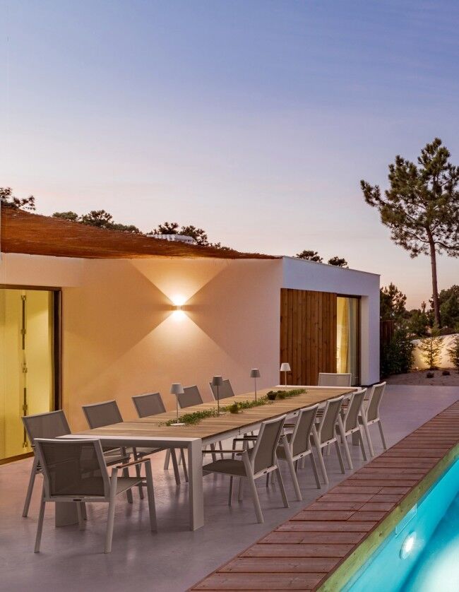 - Material: Aluminij s prašnim premazom (poliester) in tikovina na površini za eleganten in trpežen izgled.