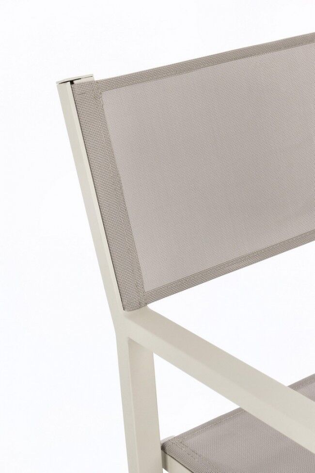 **Aluminijasta konstrukcija:** Stol je izdelan iz visokokakovostnega aluminija, kar pomeni, da je lahek, a obenem vzdržljiv in odporen na zunanje vplive. Aluminij se ne rjavi, kar zagotavlja dolgo življenjsko dobo stola.