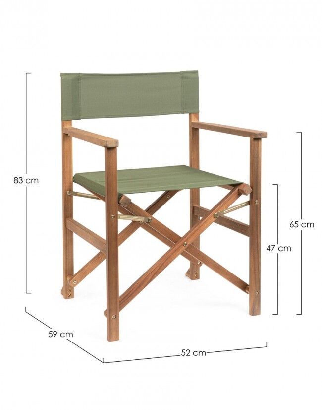 Režiserski stol NOEMI v barvi zeleni mah je estetski in praktičen kos pohištva, ki v prostor ali na vrt prinaša svežino narave. Izdelan je iz akacijevega lesa s finišem v olju, ki zagotavlja trpežnost in odpornost na vremenske vplive. Stol je dodatno ojačan z galvaniziranimi jeklenimi vijaki za večjo stabilnost. Sedež je narejen iz 230-gramskega vodoodpornega poliestra, ki omogoča enostavno vzdrževanje in odpornost na vodo. Zaradi zložljive zasnove je stol primeren za hitro shranjevanje in prenašanje, zato je idealen tako za notranjo kot zunanjo uporabo.