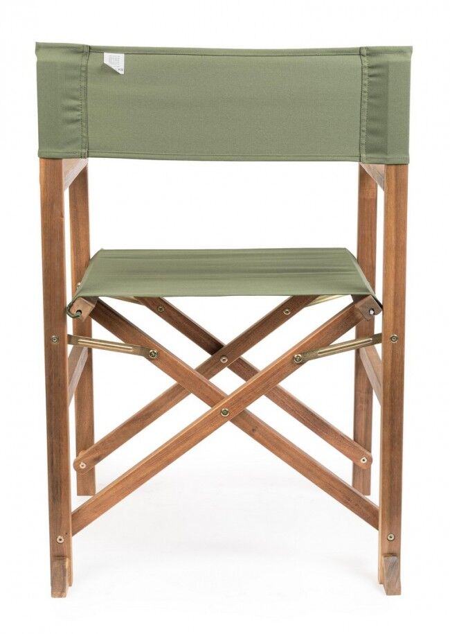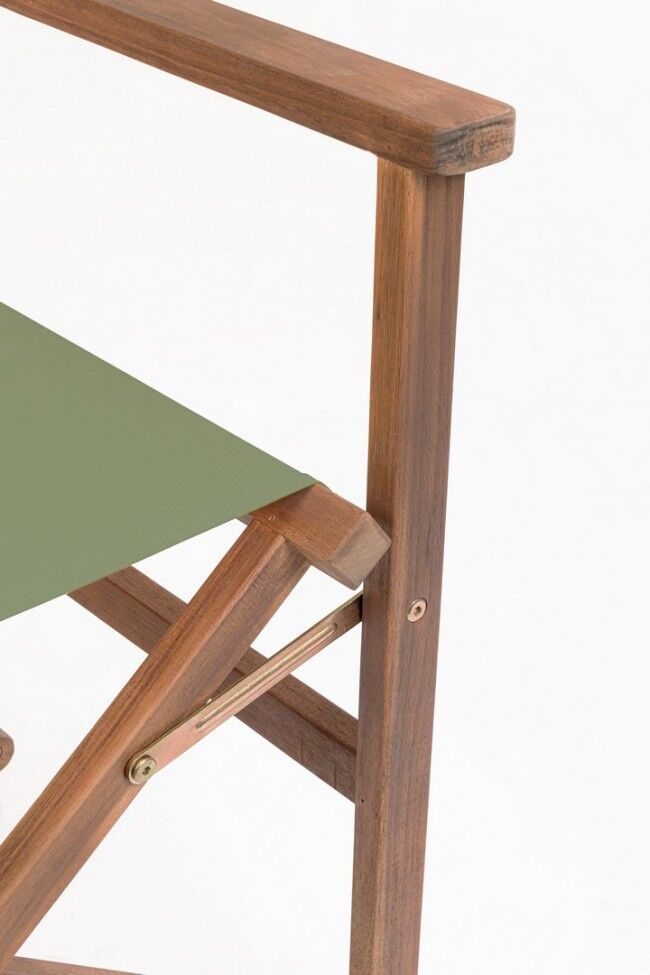 Elegantni režiserski stol NOEMI v barvi zeleni mah, izdelan iz akacijevega lesa s poliestrskim sedežem, vodoodporen in zložljiv za priročno shranjevanje. Odličen za notranje in zunanje prostore.