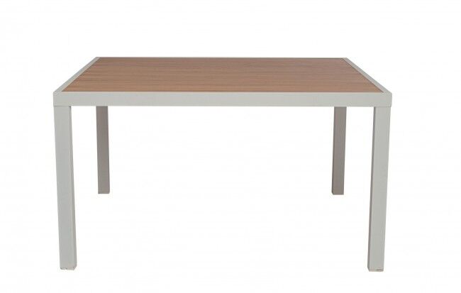 Vrtna kvadratna miza HILIJA 136x136 bela LD30 združuje stabilno aluminijasto konstrukcijo v beli barvi in ploščo z učinkom lesa za sodoben, a topel izgled na prostem.