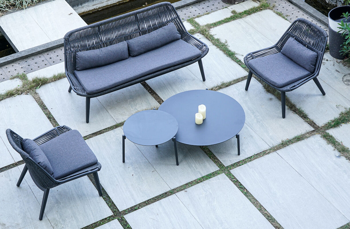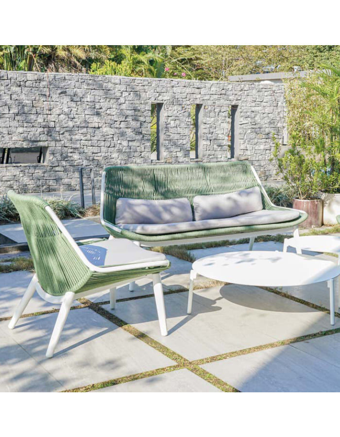 Velik izbor sedežnih garnitur, naslanjačev in postelj z elegantnim in prefinjenim slogom, izdelanih z veliko pozornostjo do vsake podrobnosti in iz odličnih kakovostnih materialov, zasnovanih za dolgo življenjsko dobo in odpornost na vse vremenske razmere. Sedežna garnitura COMO z aluminijasto strukturo in odstranljivimi blazinami iz Olefina. Sedežna garnitura Como iz aluminijastega ogrodja opleten s poliestrsko okroglo akrilno vrvico premera 9 mm.. Blazine so snemalne iz akrilnega platna. Sedežna garnitura COMO je sestavljena iz 1 dvoseda, 2 fotelja in 1 mizico model (ISLAND BIG) z aluminijasto ploščo na vrhu.