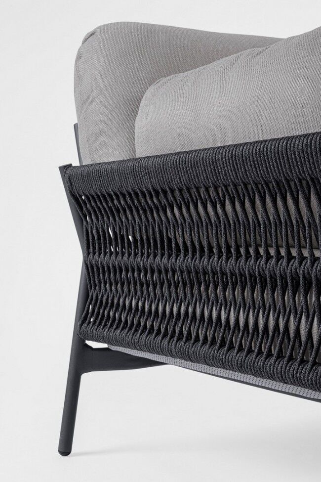 Vrtni kavč - dvosed PARDIS antracit QS22/grafit združuje eleganco, trpežnost in udobje za brezčasen zunanji prostor. Aluminijasto ogrodje, opleteno z Olefin vrvjo, in snemljive blazine iz vodoodporne Olefin tkanine zagotavljajo odpornost na vremenske vplive in dolgo življenjsko dobo. Dvosed se lahko kombinira z drugimi artikli modela Pardis, da ustvarite popoln in harmoničen zunanji ambient. Plastični čepki na nogicah ščitijo tla in preprečujejo drsenje.